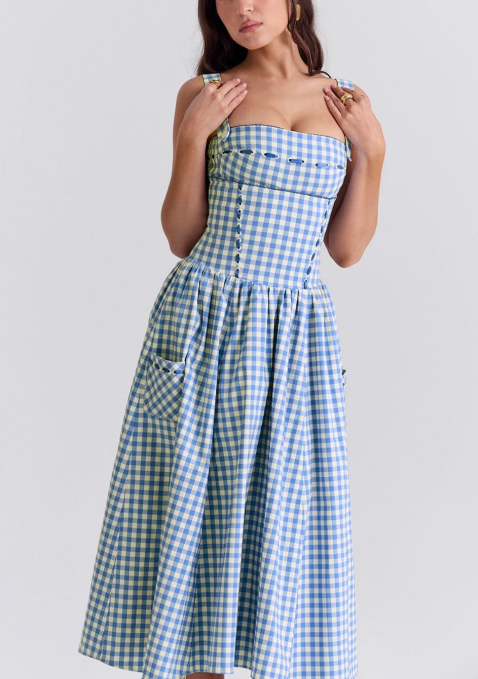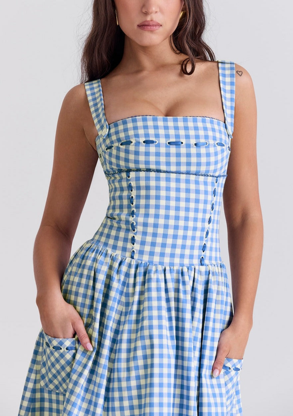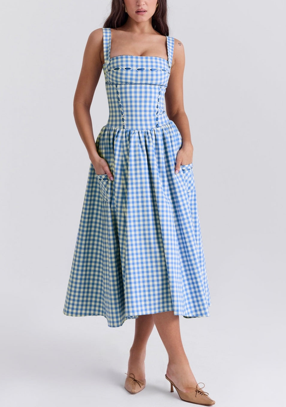 The Lily Checkered Midi Sundress offers a perfect balance of modern style and timeless appeal, making it a must-have addition to your wardrobe.